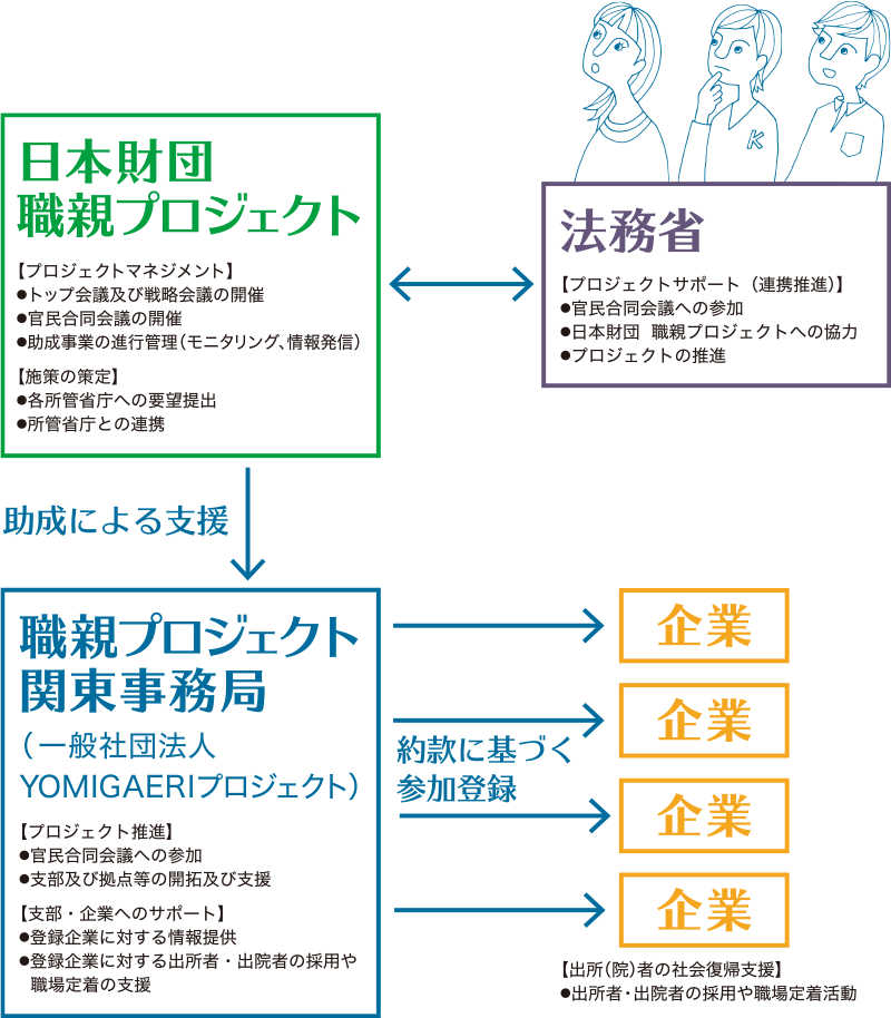 日本財団では2013年2月、就労支援を通じて刑務所出所者・少年院出院者の社会復帰を支える「日本財団 職親プロジェクト 関東事務局」を関西の企業7社と発足。